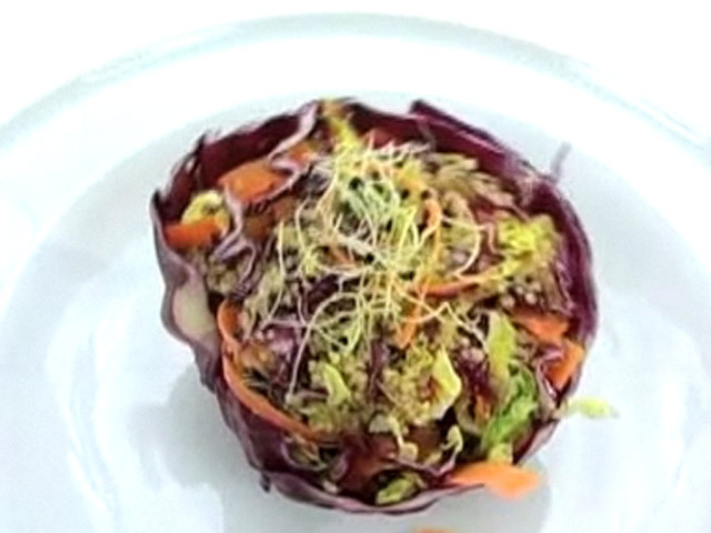 Рецепт изысканного салата.Состав:морковь — 1 штука;овощной бульон — 2 столовых ложки;куиноа — 1 столовая ложка;салат — 3 листа;красная капуста — 30 гр;перец — 20 гр;ростки чеснока, оливковое масло. Язык: Русский