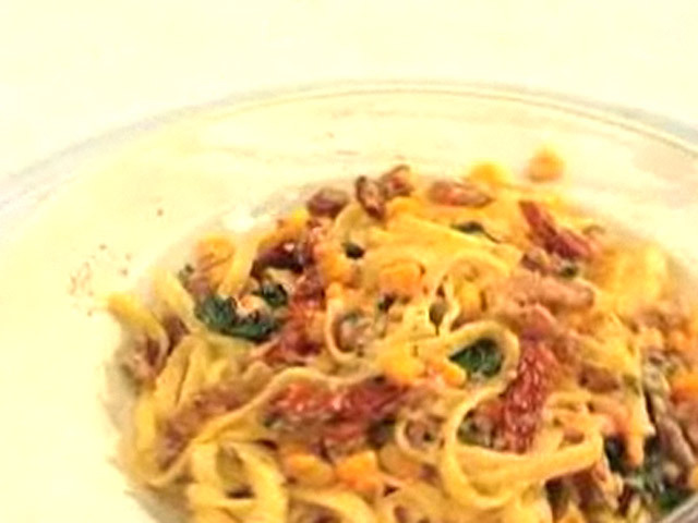 Феттучини со сладкой кукурузой и сыром горгонзолой. Итальянская кухня.На 2 порции:феттучини — 250 гр;кукуруза — 100 гр;маскарпоне — 3 столовых ложки;горгонзола — 80 гр;сушенные помидоры — 4-5 штук;порей — 4 стебля;базилик, петрушка, белое вино, соль, черный перец, оливковое масло. Язык: Русский