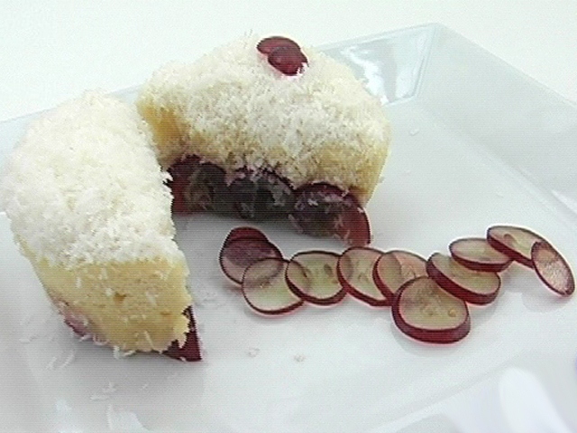Сладкое завершение обеда с пареным кокосом с виноградом и шоколадом.Состав:кокос — 50 гр;молоко — 100 гр;яйцо — 1 штука;сахар — 15 гр;мука — 30 гр;масло — 10 гр;кипяток — 1 столовая ложка;пальмовый сахар — 15 гр;немного шоколадного соуса, красного винограда. Язык: Русский