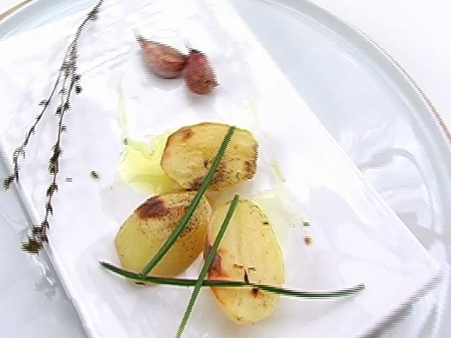 Печеная картошка Доброе блюдо на все времена.Состав:очищенная картошка — 8 штук;свежий тимьян — 6 веточек;зеленый лук — 1 пучок;сок одного лимона;чеснок — 3 зубчика;нерафинированное оливковое масло, соль, черный перец — по вкусу. Язык: Русский