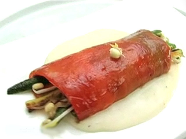 Рецепт рулета из красного перца с картофельным кремом.Состав:перец — 1 штука;соевое молоко — 1 стакан;лук — 1/4 штуки;сливочное масло — 20 гр;подсолнечное масло — 1 столовая ложка;картофель — 1 штука;кабачки — 3 штуки;соевые ростки, черный перец, соль. Язык: Русский