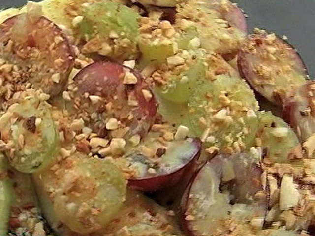 Десертное блюдо из черного и зеленого винограда.Состав:яблоки — 2 штуки;виноград — 100-150 гр;яйцо — 1 штука;миндаль — 30-40 гр;яблочный сок, клиновый сироп, лимонный сок, сахар. Язык: Русский