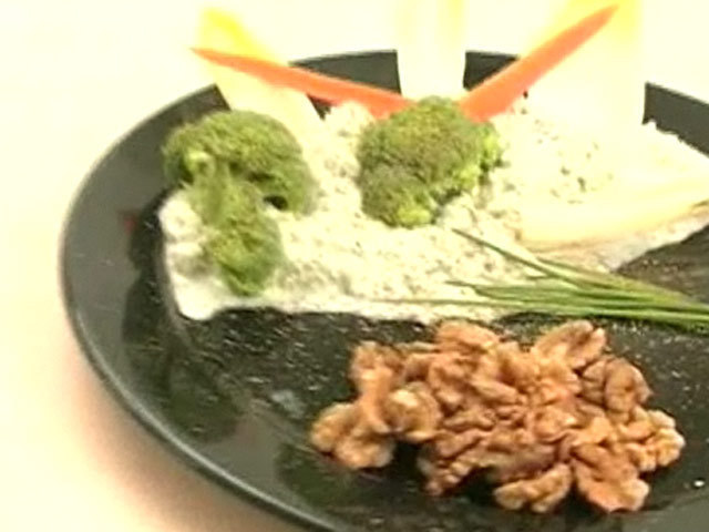 Рецепт овощной закуски с сырным соусом.Состав: сыр, укроп, чеснок, грецкие орехи, сливки, перец, соль, эндивий, сельдерей, брокколи, морковь, мускатный орех. Язык: Русский