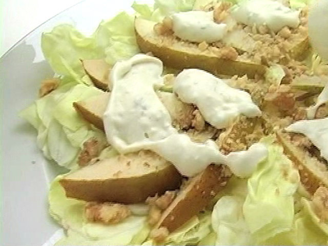 Вкусный салат из груши с сыром.Состав:салат-латук — 1 качан;грецкие орехи — 30 гр;груши — 2 штуки;лимонный сок — 2 столовые ложки;сливки — 8 столовых ложек;сыр горгонзола — 30 гр;белый перец. Язык: Русский