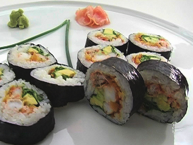 Толстые роллы «Футо-маки».Состав:креветки — 3 штуки;авокадо — 1 штука;огурец — 1 штука;салат — 30 гр;нори — 1 лист;зеленый лук — 1 стручок;яйцо — 1 штука;тесто гиоза — 5 листочков;рис — 60 гр;оливковое масло. Язык: Русский
