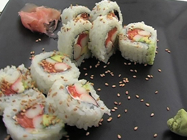 Роллы «Хура-маки».Состав:рис — 60 гр;нори — 1/2 листа;свежий лосось — 30 гр;мясо краба — 30 гр;сливочный сыр — 1 столовая ложка;авокадо — 1/2 штуки;маринованный имбирь, васаби, кунжут — по вкусу. Язык: Русский